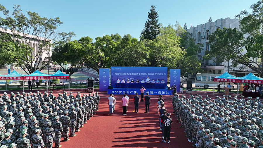为推动我校不断优化突发事件应急处置流程,有效提高师生安全意识、应急避险和自救互救能力,促进校园安全管理水平整体提升和应对处置突发事件的能力,10月12日下午,我校在第四教学楼及38、39栋学生公寓区域组织开展2022年地震逃生暨高层消防疏散应急演练。广东省教育厅安保处一级主任科员蒋文瑾,广州市黄埔区消防救援大队副大队长卓健生,龙湖街道党工委委员、武装部部长卢希斌,龙湖派出所副所长王振华,龙湖街道应急办主任周向红,龙湖派出所驻校警长范志红,我校校长马蔚兰,副校长李锦堂、郭航出席演练活动。副校长何柏略担任演练总指挥,黄埔区消防救援大队及五福堂消防救援站协助参演,各相关职能部门负责人、辅导员、军训教官、公寓管理人员及2022级新生近2000人参与。