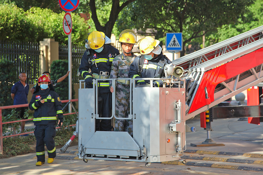 15点整,何柏略在听取现场准备情况汇报后,下达“演练开始”的指令。随即警报响起,学生就地采用相对安全的方式进行室内避震。一分钟后,在发出“紧急疏散”铃声后,学生迅速进入紧急疏散状态,在现场疏散员的指引下,按照“分两行、靠两边,先低层、后高层”的疏散程序,用书本护住头部,弯腰沿着逃生楼梯快速下楼,根据指定路线迅速有序撤离到学校安全区域。随后辅导员清点人数,向总指挥汇报疏散情况。地震逃生演练结束后,38栋学生公寓模拟起火点报告“火情”,现场烟雾弥漫,1名同学被困于宿舍内,1名同学受伤。接到报警后,现场总指挥向相关部门发出救援指令,消防车和专业救援人员迅速进入火场,用高压水枪对模拟起火位置实施灭火,并架起云梯营救被困学生,医疗救护组医护人员立即将受伤人员运送至安全区实施救助。所有参演人员陆续抵达指定地点,核实人数无误,疏散演练圆满结束,整个过程有条不紊、井然有序,达到了预期目的,切实提升了应急避险能力。