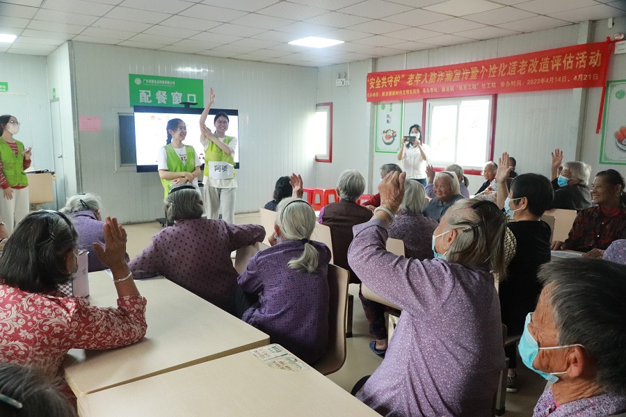 在向阳学堂活动中,志愿队伍以每周不同主题进行小课堂教学,从教材知识到课余兴趣知识,课堂的小老师都会安排在课堂之中;而在长者安置区内,实践队成员更是通过演戏的方式把防诈骗内容更加贴切地给长者们宣传,同时也在活动结束后与长者进行深入交谈,做好记录,最终作出评估内容报告。